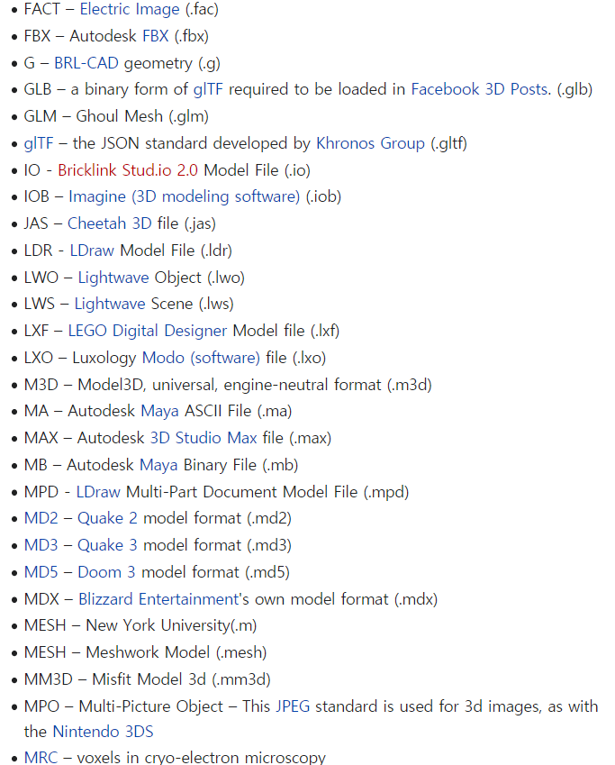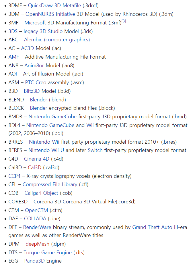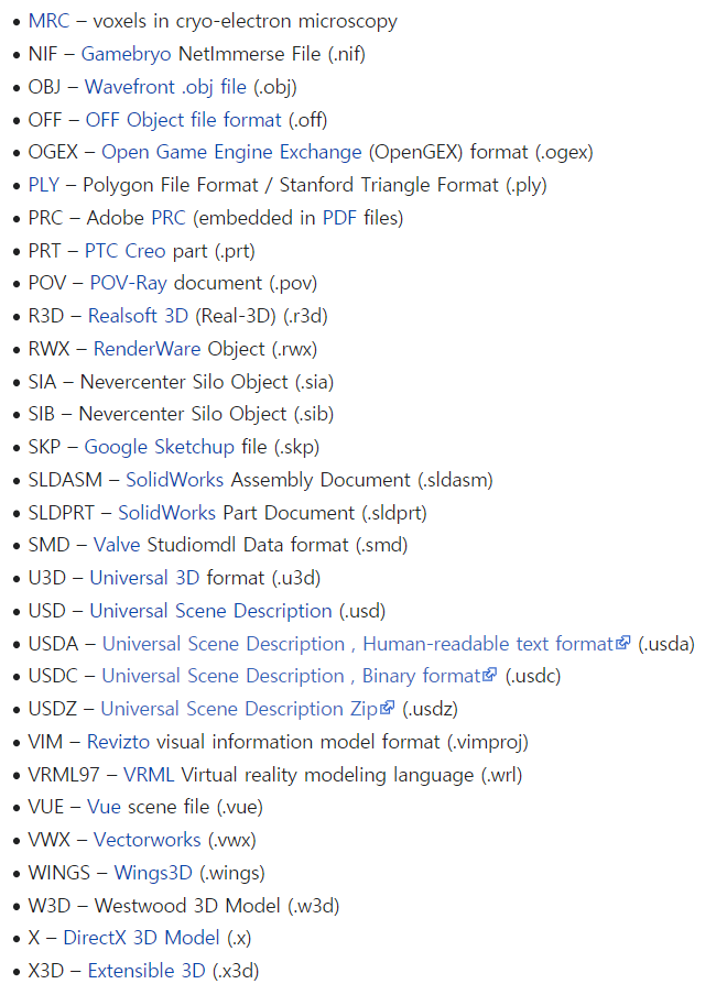 아래 그림과 같이 수많은 File Format들이 있지만 이 중에서도 많이 사용하는 OFF, OBJ, STL에 대해서 알아보도록 하겠습니다. 또한, 알아보기 쉽게 Binary 파일이 아닌 ASCII 파일 기준으로 설명하도록 하겠습니다.