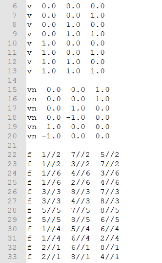그 다음 Line 부터는 V의 개수만큼 V의 정보가 나열되어 있습니다. 각 V는 "V.x, V.y, V.z"의 좌표를 가지게 되며, 위의 그림에서 보면 Cube의 첫번째 V는 3번 줄에 있는 (-1, -1, -1)를 좌표로 가지게 됩니다.