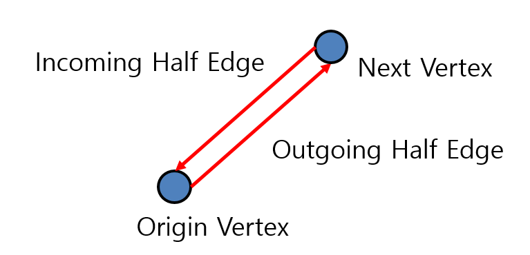 먼저 Half Edge란 방향성을 가지는 Edge를 뜻합니다. 따라서 하나의 Vertex는 본인의 Position과 자기자신에서 Next Vertex로 향하는 Half Edge 한개를 가지게 됩니다. 우리는 그것을 Outgoing Half Edge라고 하고, 다른 Vertex에서 자기자신으로 오는 Half Edge는 Incoming Half Edge라고 합니다. 아래 그림을 참고하면 이해하기 쉬울 것 같습니다.
