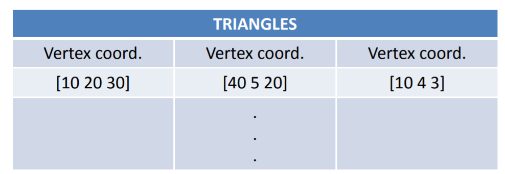 첫 번째는 Face Vertex Lists 입니다. Face Vertex Lists는 Face를 기준으로 쭉 나열하되, 각 Face마다 Face를 이루는 vertex를 3개씩(Triangle Mesh기 때문) 나열 하는 것입니다. 우리가 이전 포스팅에서 봤던 file format 중 STL이 이 방법으로 이루어 진 것을 확인하실 수 있습니다.
