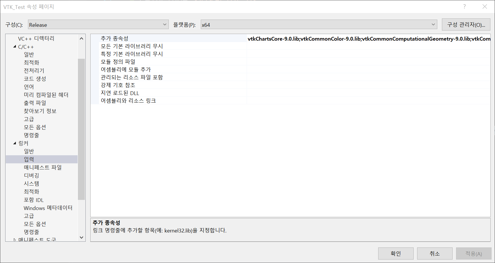 그럼 이제 이 이름들을 다 긁어서 앞에서 켜놨었던 링커 -> 입력 -> 추가 종속성에 다 붙여넣기 해주시면 됩니다!